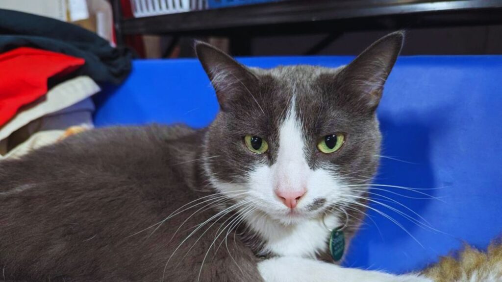 A therapy animal and Instagram star. A customer greeter who has been called the laziest employee on staff. Global Neighborhood Thrift & Vintage’s resident cat Smudge has many roles. For nearly all of his three years the green-eyed gray and white feline with a smudge of gray on his left cheek has been living a comfortable life at the local nonprofit’s Logan neighborhood warehouse & store. Beloved by staff and shoppers Smudge is definitely a local celebrity cat.